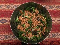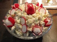 Sigrid writes: This is my variation of a salad served at a German friend’s house! The proportions of the ingredients are my approximations and can be changed. I like celery root that is not used much here, but you can substitute several sliced-up celery stalks.