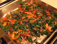 A colorful combination of red peppers and kale flavored with garlic, lime juice and red pepper flakes.
