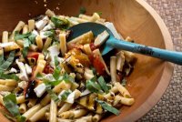 You don’t find pasta salads in Italy, but in very hot weather, room temperature or cooled-down pasta with vegetables can be quite delicious, prepared in advance for a casual picnic or supper. Here, the quantity of juicy ripe tomato and eggplant makes this pasta dish more like a vegetable salad.