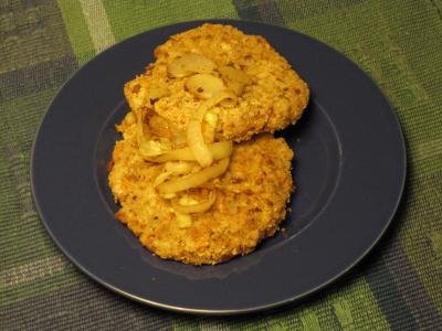 Shape the mixture into 4 patties. Spread the remaining 1 cup bread crumbs on a plate and coat the patties on both sides. Heat the oil in a large skillet over medium-high heat until hot. Add the patties and cook about 3 minutes per side. I sauteed some onion slices in the pan at the same time and served them together.