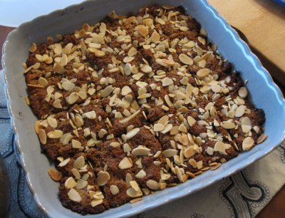 7. Press the mix into a 10x10 or 9x13 cake pan. Sprinkle almond slices on top. 8. Bake at 350 for 25-30 min. The bars will be moist inside.