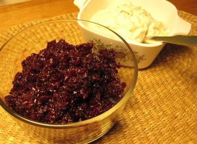 An excellent combination of tangy chopped beets and smooth cashew sour cream.