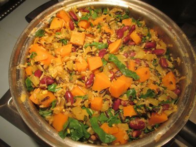 A colorful combination of rice, beans, squash and chard with curry flavors.
