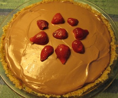 With food processor or blender running on low (or off is even better), slowly pour the saucepan mixture into the tofu. (It will not really “pour” – more like adding it in small chunks at a time. Add some chocolate, blend, add some chocolate, blend, etc.) DO keep the lid on the food processor when it’s on, or you’ll have chocolate over your entire kitchen and self, especially if you add much at a time! Blend both together until completely smooth. Pour into the graham cracker piecrust and chill for at least a couple of hours, or overnight. May top with strawberries or other fruit.