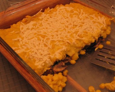 3. Layer half of the tortillas across the bottom of the baking dish. Sprinkle a thin layer of cheese across the tortillas. Spoon the spinach and mushroom mixture across the cheese and spread evenly. Add a second layer of tortillas across the spinach-mushroom combination. Pour out the corn sauce across the tortilla and then finish by spreading a layer of cheese across the sauce.