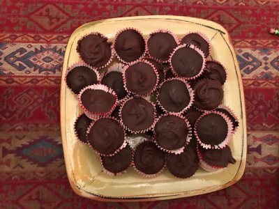 Susan noted: The almond butter mixture was very dry, so I added about 2 tablespoons of almond milk. 2nd point: Initially, I made the filling blobs too big. They should be small enough for the chocolate to ooze down around them to make a solid side wall. Also, it might be a good idea to add a couple tablespoons of almond milk to the melting chocolate to make it more fluid. I made the bases too thick because I wanted to cover the whole bottom of the candy, but if the chocolate had been more liquid, I could have covered the bottom with a thinner coat. The problem with the thick coat is that (1) it makes the candy hard to eat, and (2) you need far more chocolate than the recipe calls for. I ran out mid-recipe and had to go back to the grocery store; eventually, I needed about 2 x as much. BTW, vegan choc chips are fine.