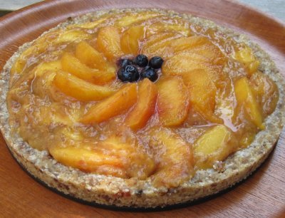 Place 1 cup of the peaches, the soaked dates, lemon juice and nutmeg in the processor and process until smooth. Transfer this slurry to a bowl. If you are feeling artistic, reserve 12 of the remaining slices to make a decorative whorl on top. Mix the rest of the peaches into the bowl with the date-peach slurry. Take the crust from the freezer and spread the peach mixture into it. Use the reserved slices to make a whorl or other design on the top and add a few berries if desired.