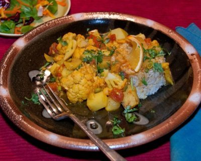 "Another knockout Indian recipe" featuring cauliflower and potatoes made colorful with peas, tomatoes, and turmeric. Serve it all over hot rice.