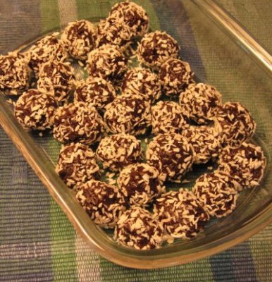 To make them without a food processor, cut the dates and prunes in quarters and toss with some of the cocoa powder to keep them from sticking while you mince them. In a bowl, stir the remaining ingredients into the minced fruit. When well blended, form into one-inch balls and roll in the coconut.