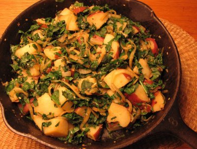 This is so simple and so tasty----the comfort of potatoes along with plenty of greens, flavored with garlic, paprika, and sesame.