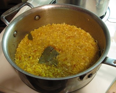 Heat one tablespoon vegan butter or olive oil in a heavy saucepan with a tightfitting lid. Add the garlic and onion and cook, stirring, until the onion is wilted. Add the saffron, bay leaf and rice and cook, stirring, about 30 seconds.