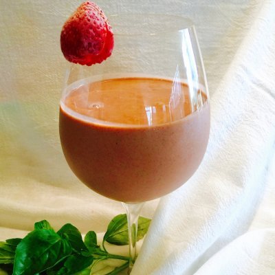 Many mornings I go to my computer and The New York Times Cooking site http://cooking.nytimes.com for one of the dozens of interesting smoothie recipes posted by Martha Rose Shulman. Practically all of them can be adapted easily by using non-dairy milk or substituting agave nectar etc. for honey. Because of a recent freezer-door-left-open disaster, I had 1/2 cup of strawberry juice that had to be used, so I ended up turning Shulman's Pineapple-Basil smoothie (which is also very good) into a Strawberry-Basil smoothie, and I recommend it as a lovely treat in basil season.