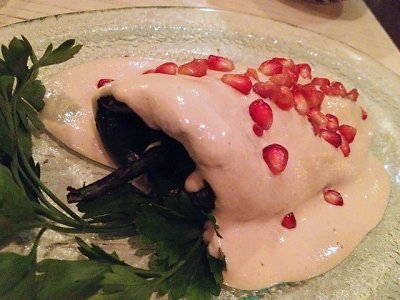 Combine walnuts, crema and almond milk in blender and blend until smooth. Add more almond milk to thin to a medium thick sauce. Add salt to taste. When chilies are done, remove foil, move chilies and sauce to a serving dish, pour walnut sauce across the chilies, and top with pomegranate seeds.