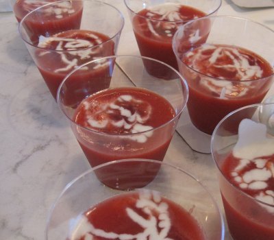 How to serve? This gazpacho is best served chilled. If you prepare in advance, keep the soup and raspberry sauce in the refrigerator until it is time to serve. For a pretty presentation, you may serve the gazpacho in the skin of the watermelon! For each person, pour 2 ladles of gazpacho in a soup dish, drop a portion of raspberry sauce in the middle, and decorate with a few mint leaves and a drizzle of coconut milk.