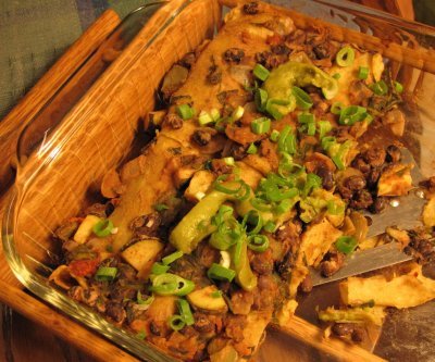 Bake covered for about 20 minutes. Spread guacamole over the top and sprinkle with green onion.