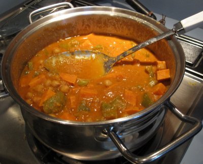 Stir in green peppers, sweet potatoes and coconut milk. Bring to a simmer, cover, and cook 30-40 minutes.