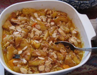 3. To serve the curry, place it in a serving dish and distribute the pineapple, the scallions and the almond slivers over it. Serve hot.