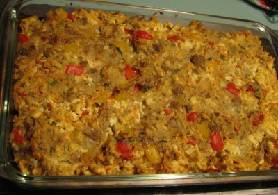 Heat a large pan and add oil and wait until it shimmers. Add the sausage and break up into small pieces. Cook until slightly brown. Add potatoes and bell peppers to the sausage in pan and cook until potatoes begin to brown. Add the scallions and cook another 3-5 minutes. Add potato-sausage mixture to tofu mixture. Combine well.