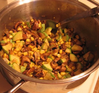Cook the onion in 1 T. of the water, stirring frequently, until the liquid has evaporated. Add the zucchini, mushrooms, and the remaining tablespoon of water. Stir in the cumin and chili powder and simmer 5 minutes until the mushrooms are soft.