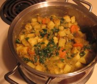 David makes this dish without baking and adds an arrowroot-water mixture to thicken the rich bean “gravy.” I like the slight crust formed by the baking process, so I did not use arrowroot and baked the beans in a casserole dish at 350F—15 minutes with lid and 15 minutes without.---Susan B.