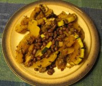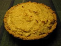 This recipe is from Vegan Brunch, by Isa Chandra Moskowitz. I have departed from her recipe in some details. Vidalia onions were not available, so I asked the grocer for any sweet onions. Four onions were still short of 3 pounds, but this was ok because my package of tofu weighed only 12 ounces, not a pound—and even so, I had a generous filling for the pie. It would have been hard to heap more filling into the shell. Speaking of the shell: instead of using Ms. Moskowitz’s recipe for the crust, I used my old standard, a recipe published decades ago by Mazola—which works just as well with canola oil.